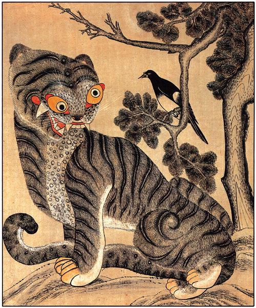 In late Joseon Dynasty folk paintings, a recurring theme known as Hojakdo (Tiger and Magpie) features these two creatures together. The magpie symbolizes good news, while the tiger—often drawn with exaggerated, almost comical expressions—represents authority or oppressive power. These paintings offered a playful yet sharp satire of ruling elites, allowing the common people to express both hope and critique through art.