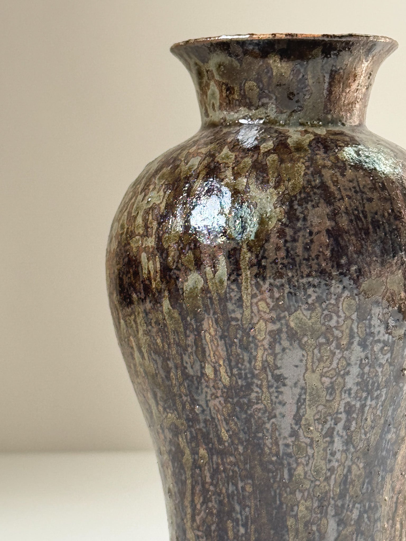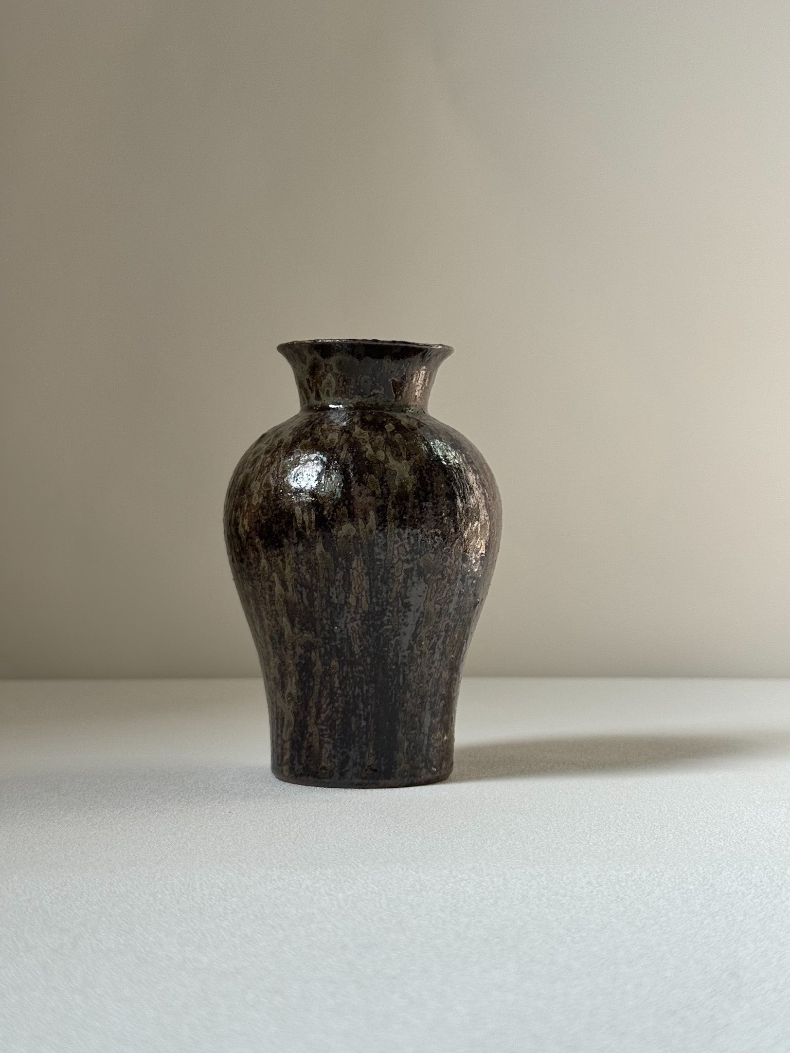 The Starlit Rain Black Onggi Vase embodies the serene beauty of Korean Onggi, reimagined through Shiheun Han’s distinctive brush-mark technique. Its deep black sheen, subtle yet luminous, evokes the earth after rain touched by moonlight. With graceful curves and refined presence, this vase is both a functional vessel and a collectible piece of contemporary ceramic art.