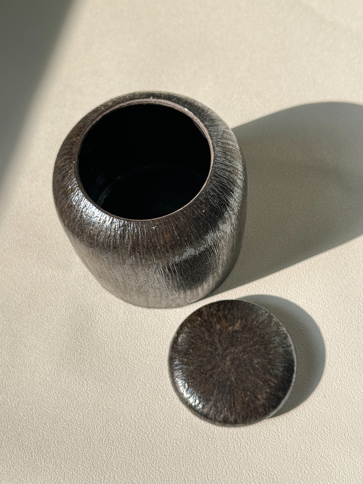 The Starliet Rain Onggi Tea Caddy reimagines Korea’s Onggi tradition with hand-carved brush textures and a natural glaze that shimmers like rainfall. Offered in Brown and Black, each caddy carries its own character—perfect for storing tea leaves, herbs, or simply admired as a collectible piece of art.